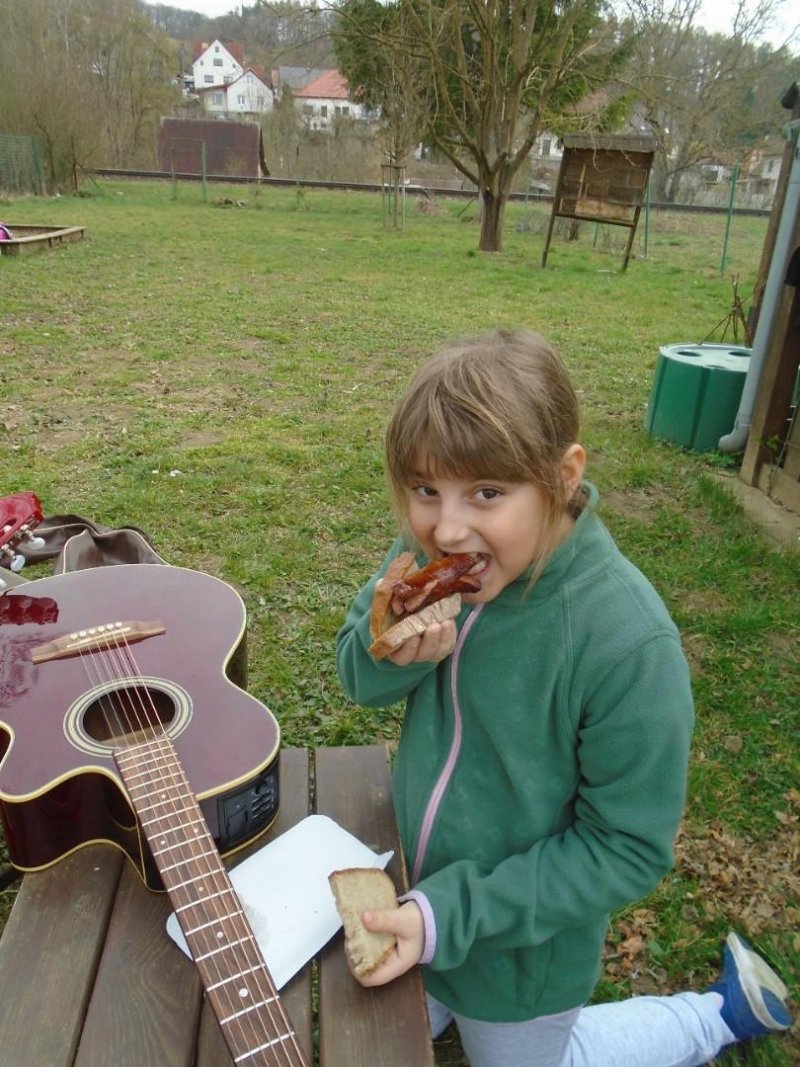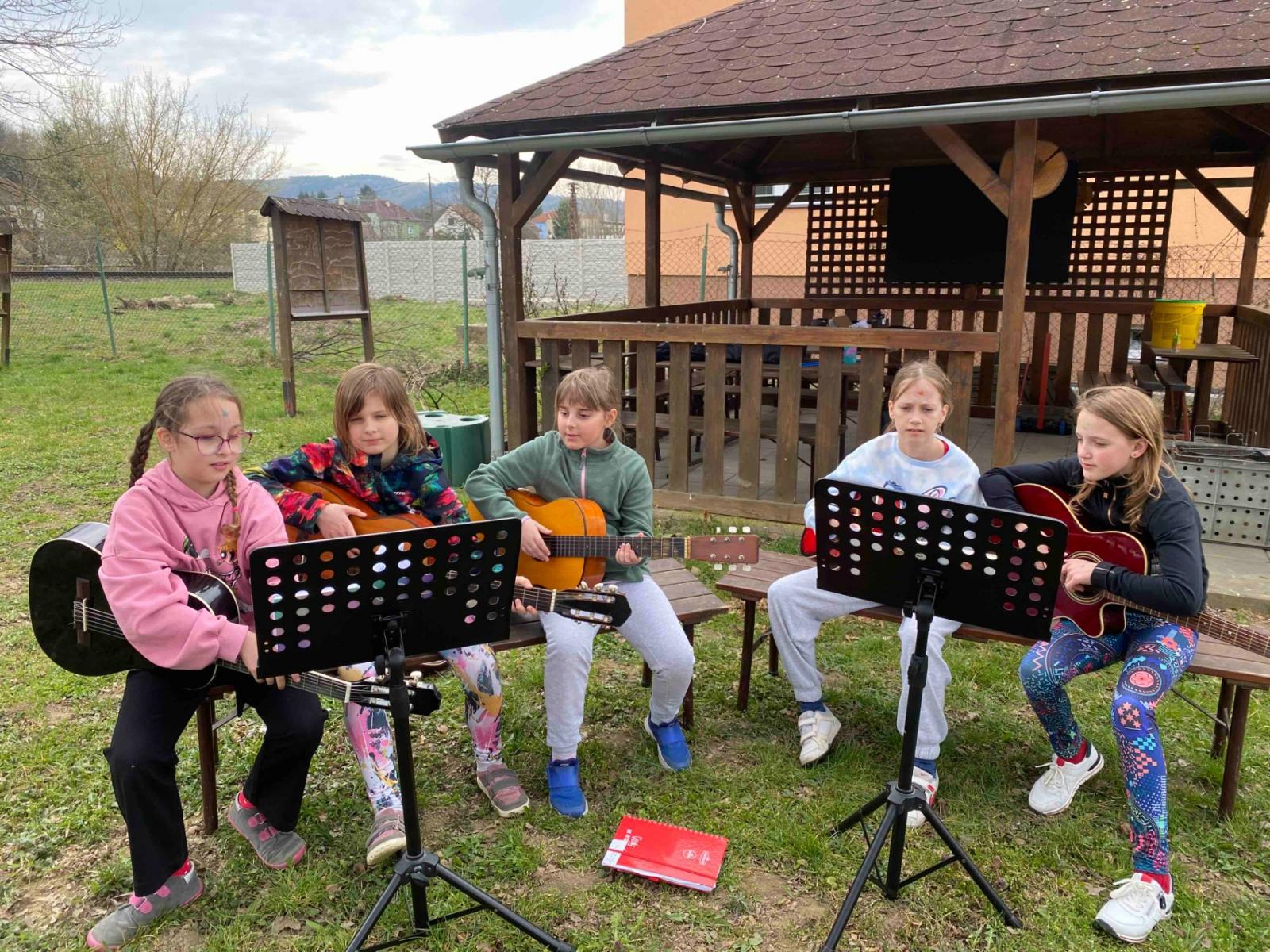 Celé odpoledne jsme si užívali na zahradě, kde jsme si opekli špekáčky a nasávali první opravdovou jarní atmosféru. Příjemnou náladu ještě podtrhlo hraní na kytaru, o které se postarala děvčata, a vytvořila tak krásné hudební pozadí celého setkání.
