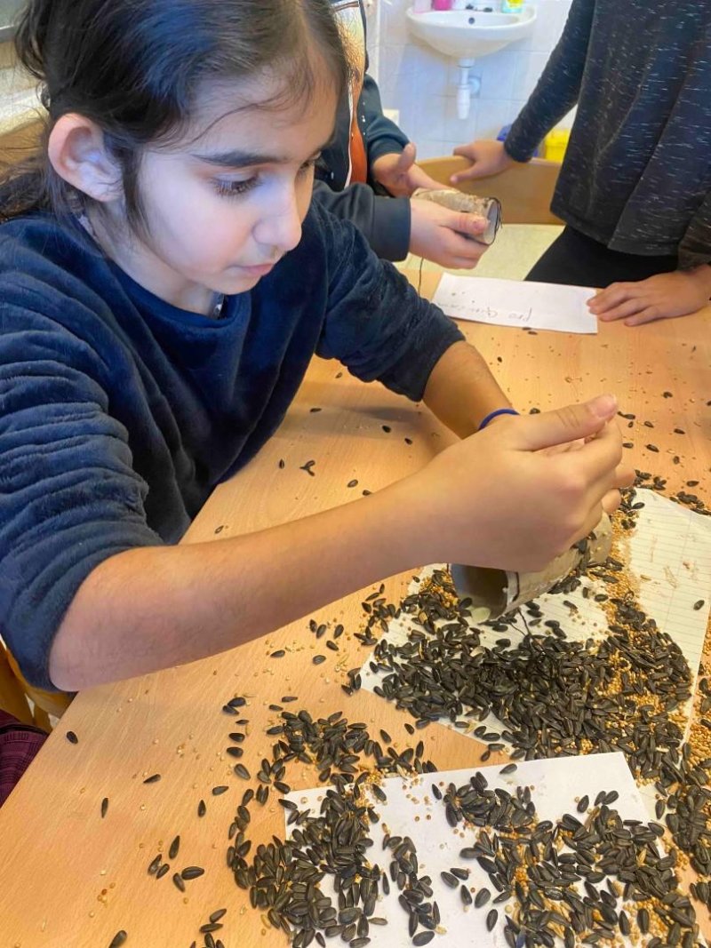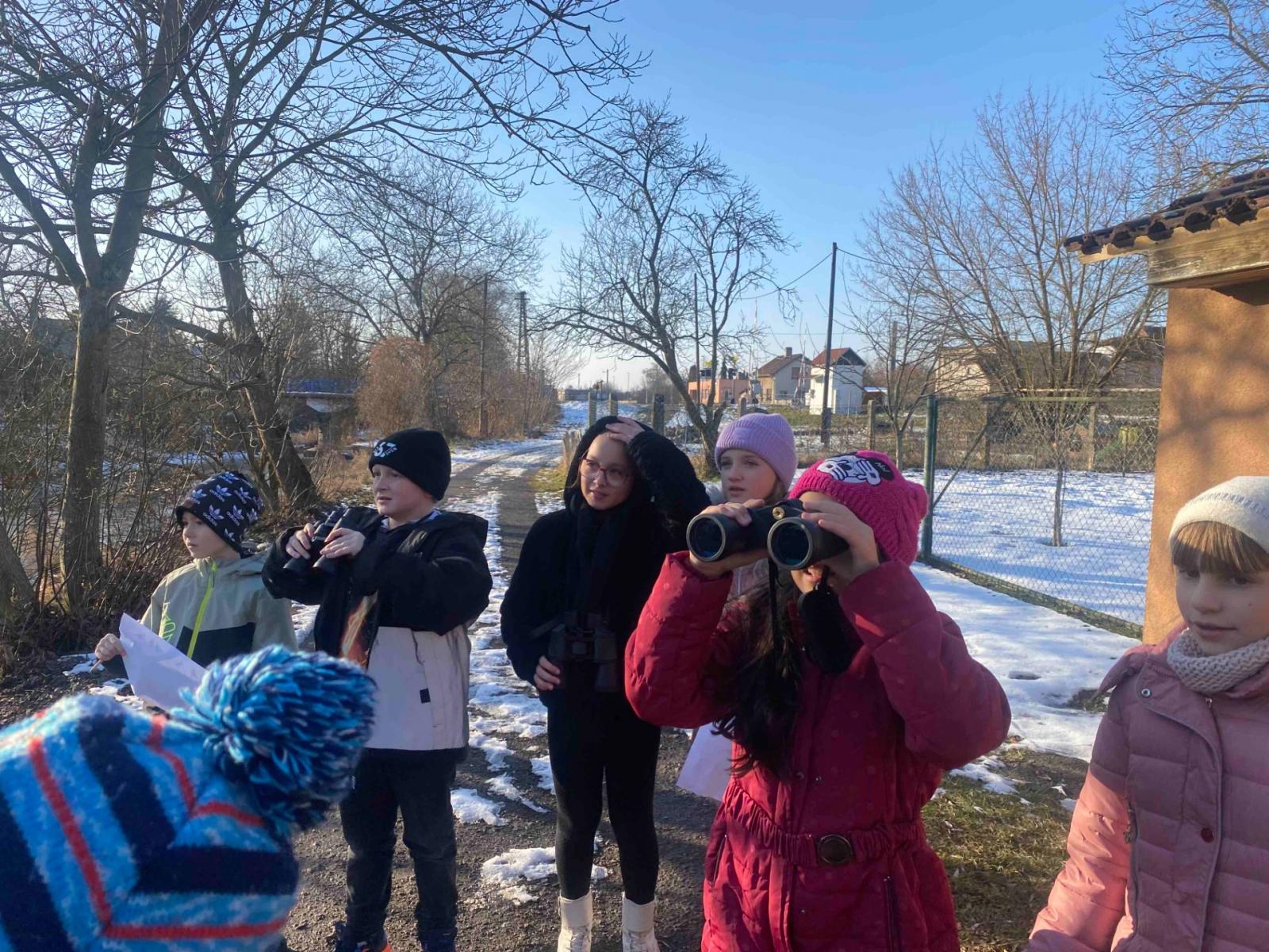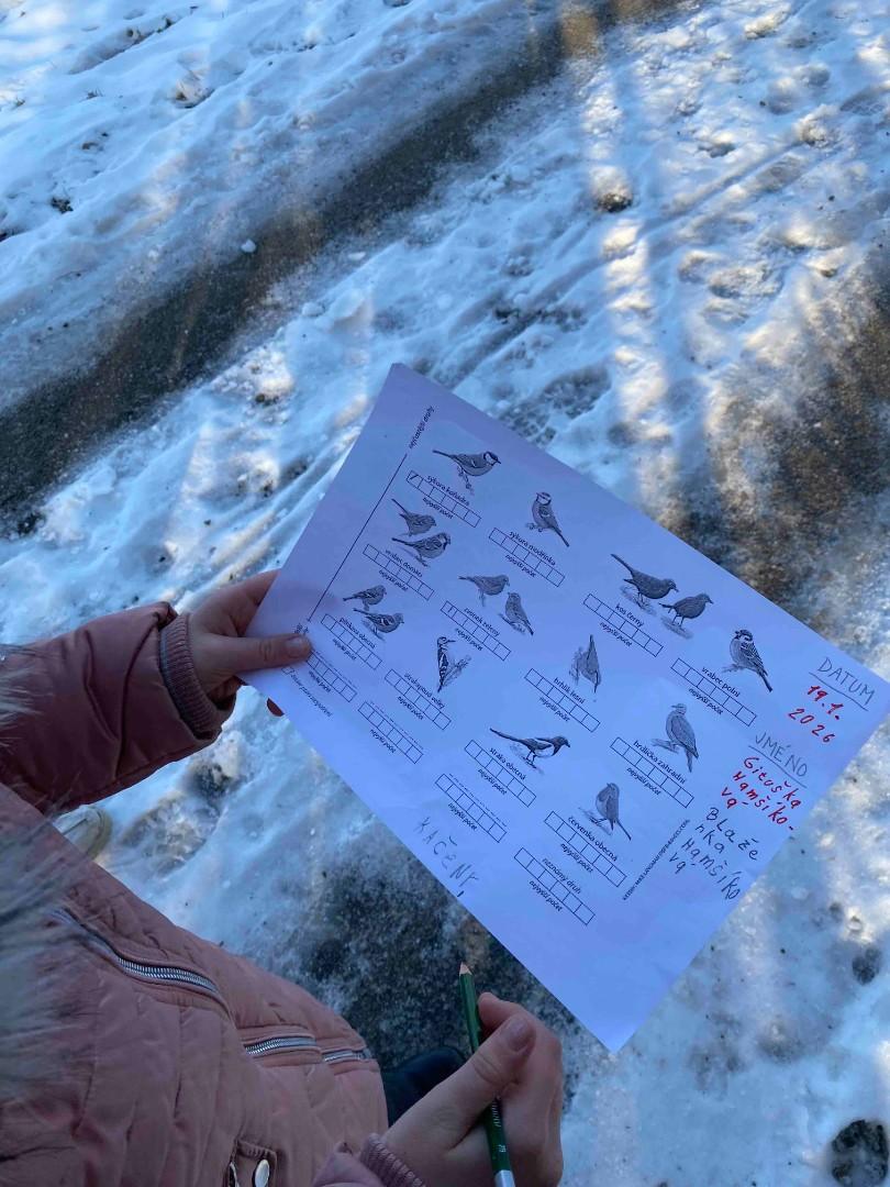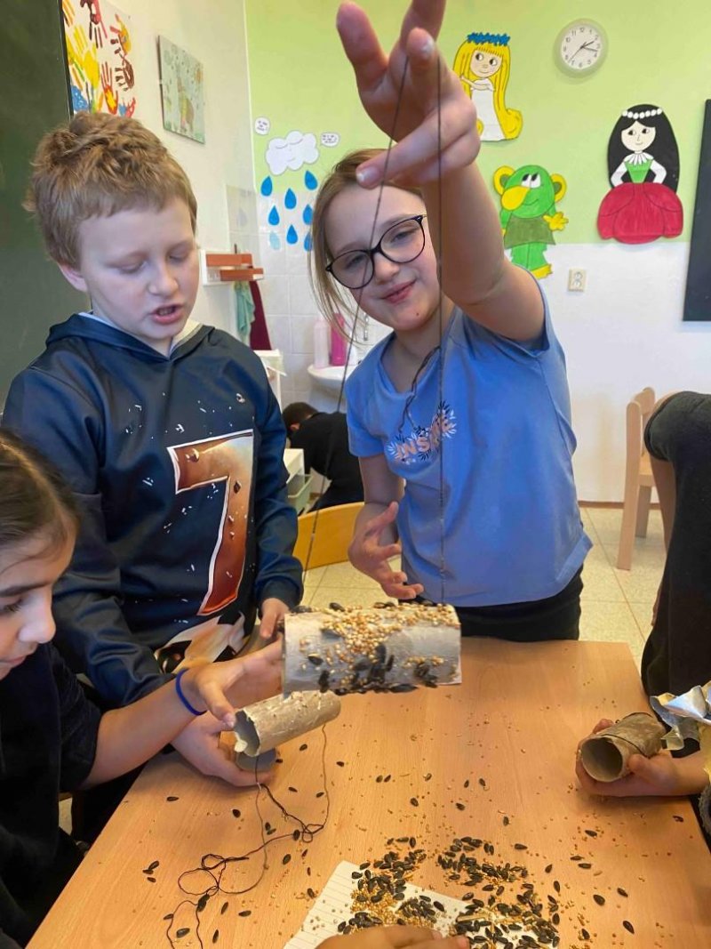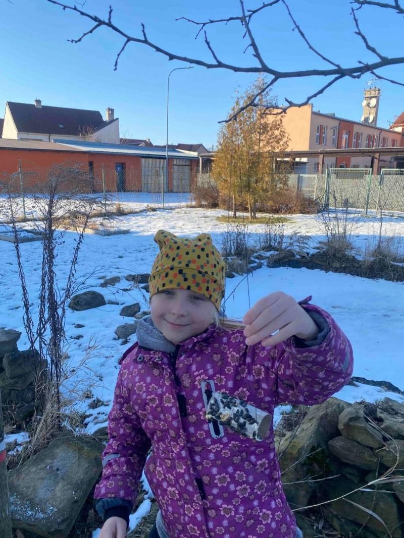 V lednu jsme se zaměřili na ptáčky, kteří u nás zůstávají přes zimu. Společně jsme je pozorovali v přírodě a své poznatky si zapisovali. Pro ptáčky jsme připravili potravu – obalovali jsme ruličky semínky a ty jsme pak zavěsili na školní zahradu. Povídali jsme si také o ptácích, kteří odlétají do teplých krajin, a o tom, proč tomu tak je.